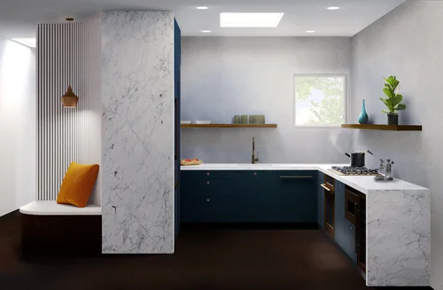 In a deliberate departure from the trend of natural stone, this project prioritized environmentally conscious material selections. Kitchen counters and stairs are clad in an innovative composite made of paper pulp and eco-resin—thin, resilient, and sustainable. Finished with a subtly leathered texture, this material lends a tactile softness to the crisp, modern lines of the design.