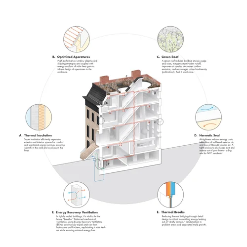 Floor plan improvements include a new accessory door behind the stair, providing seamless access to the unit’s adjacent deeded parking garage. The kitchen features a unique round island, cleverly designed with integrated stools and ample storage. Upstairs, an oversized pocket door separates the primary suite from the rest of the home. Detailed with walnut fins and resin inserts in a gradient of orange hues, this door functions as a kinetic, light-filtering object, breaking its large scale while maintaining privacy.